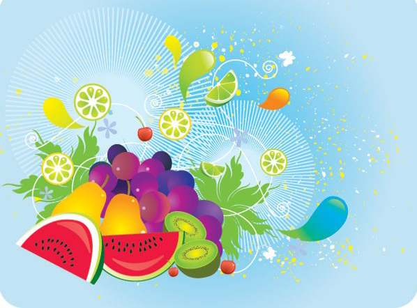 矢量果蔬,水果,五彩缤纷,潮流元素,西瓜,梨,葡萄,猕猴桃,香橙,柠檬,放射线