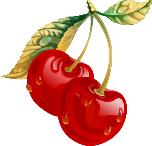 矢量水果,诱人,水晶质感,黄桃,樱桃,水珠,叶子