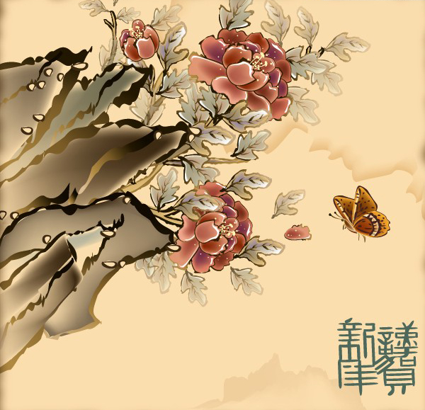 中国风格的吉祥蝶恋花矢量年画: