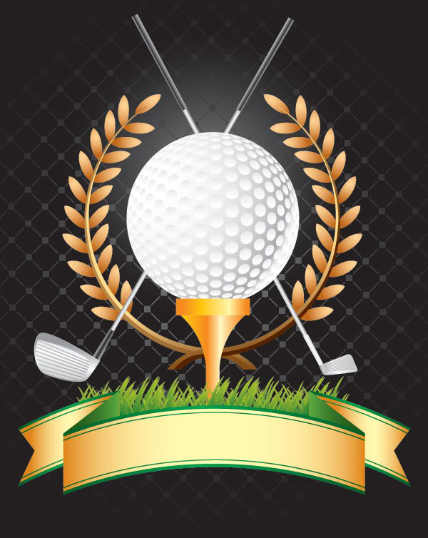 EPS格式,含JPG预览图,关键字:体育运动矢量素材,矢量高尔夫球,高尔夫球杆,麦穗,金色,丝带,青草,运动,矢量素材