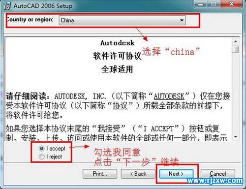 第7步、国家与地区设置china, 设置I accept我接受,点击下一步。