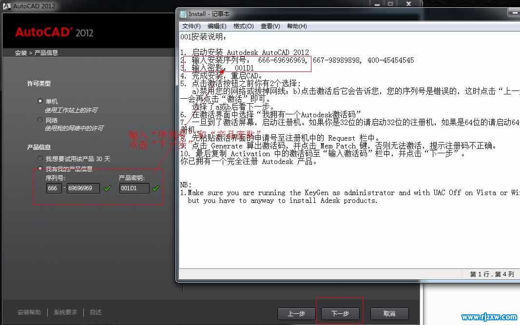 第9步、回到安装的界面上,在序号上面输入666-69696969,产品密匙上面输入001D1。然后点击下一步。