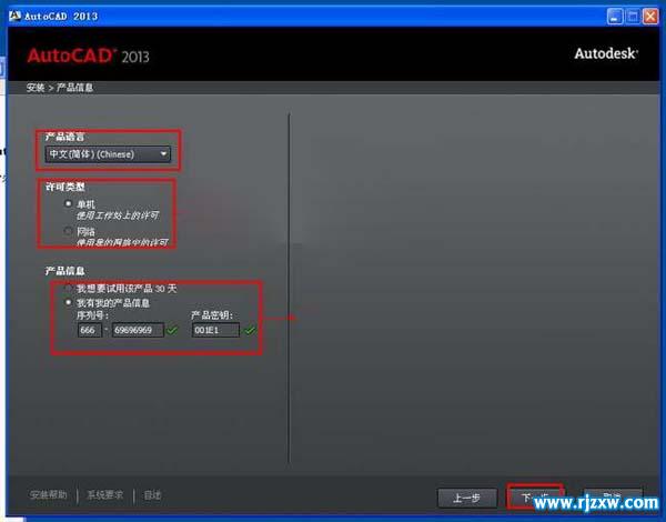 第5步、产品语言选:中文(简体),许可类型选:单机,产品信息:序列号填666-69696969,产品密钥:001E1,然后点击下一步。