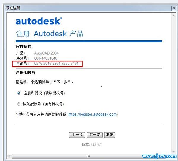 | 软件简介: 第1步、打开CAD2004软件,弹出来注册产品,点击进入注册,就可以看到下面的申请号,选上申请的数字,按Ctrl+C复制。点击下一步。