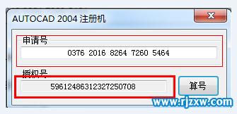 第2步、打开下载好的CAD2004注册机,把申请号复制到注册机的申请上面,点击算号。然后授权号就出来了。