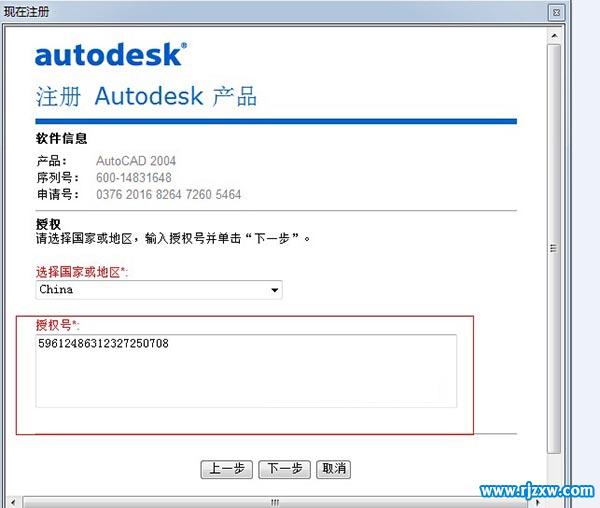 第3步、然后在国家与地区选上China,把注册机上面的授权号复制到CAD2004注册页面上的授权号的框里。再点击下一步。