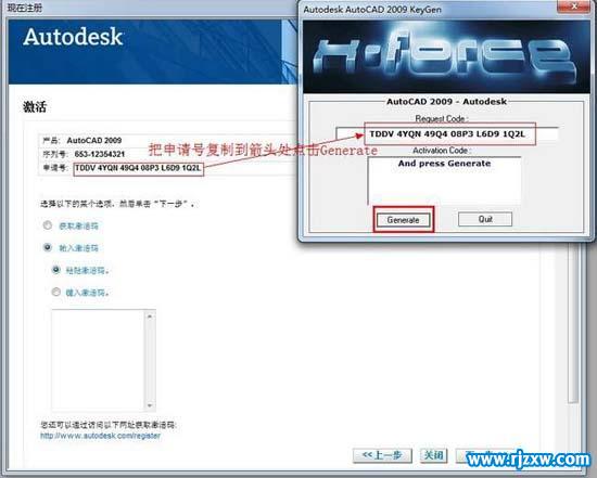 第6步、然后点击Generate获得了激活码,把注册机上面的激活码复制到注册页机里面的激活码框中。点击下一步。