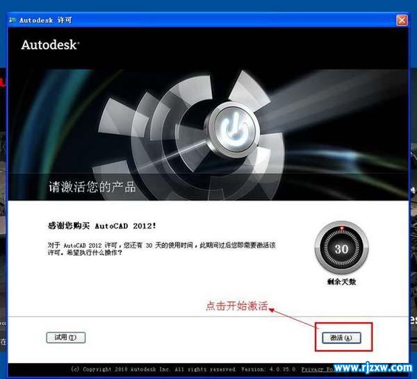 | 软件简介: 第1步、双击打开安装好的CAD2012 64位软件,进行激活。