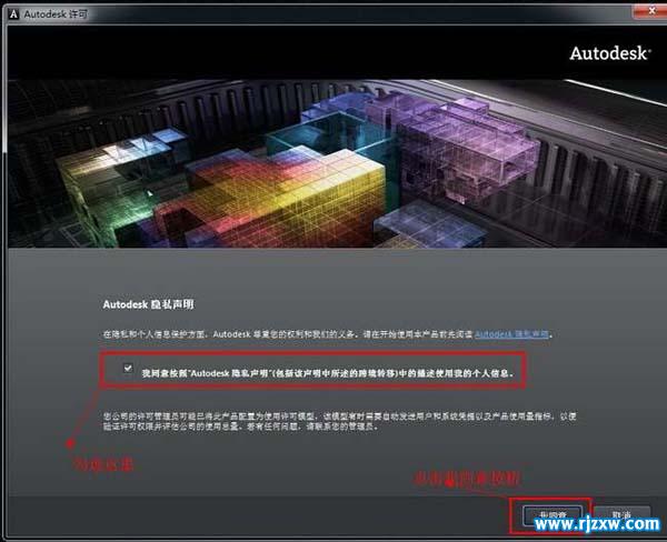 第3步、选中我阅读了AUTODESK的声明,点击我同意。