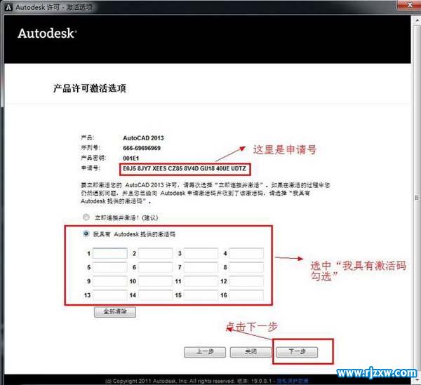 第4步、进入产品许可激活选项,记好申请号,选中我具有Autodesk提供的激活码。