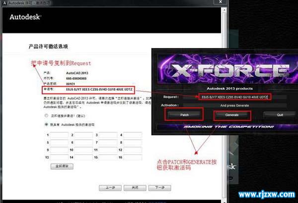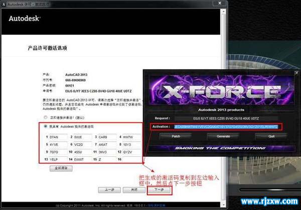 第7步、选点击PATCH,再点击GENERATE,就这样获得了激活码。把得到的激活码复制到页面的激活码框里,点击下一步。