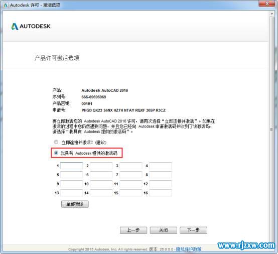 第5步、进入输入激活码状态,注意申请号,勾选我具有Autodesk提供的激活码。