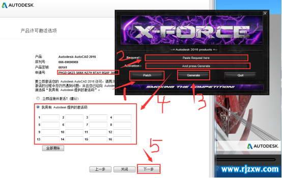 第7步、然后把申请号复制到注册机的申请框里面,先点击Patch,再点击Generate获得激活码。把激活码复制到申请的页面里面。