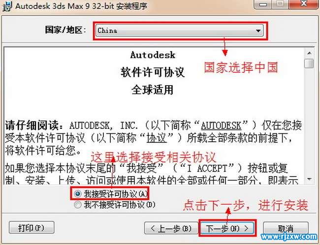 第4步、选择我接受许可协议。选中国家/地区为China。点击下一步。