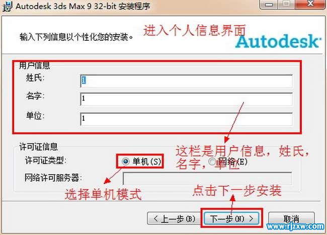 第5步、个人信息可以随便输入。选择单机。点击下一步。
