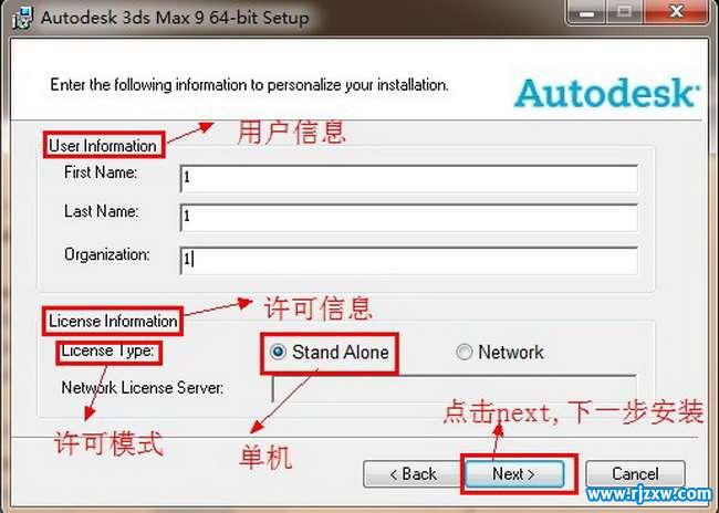 第6步、进行用户信息,可以随便填写。选单机Stand Alone模式。点击下一步。