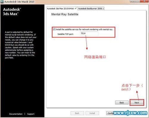 第10步、网络渲染端口这里保持默认,有些安装包会提示安装sp1补丁。点击next下一步配置。 如图十。