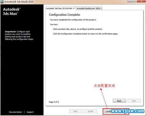 第11步、3dsmax2010 32/64位英文版配置完成,点击配置完成(configuration complete)返回到3dsmax2010 32/64位英文版安装界面。 如图一十一。