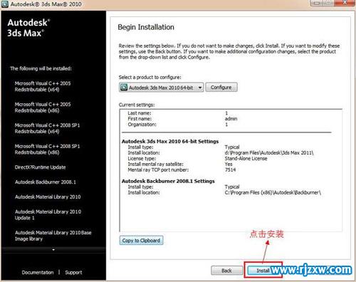 第12步、确定3dsmax2010 32/64位英文版配置完成后,点击安装(install),正试进入安装程序。 如图一十二。