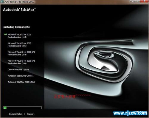 第13步、3dsmax2010 32/64位英文版正在努力安装中,等待几分钟。 如图一十三。