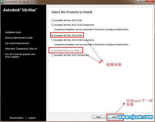 第4步、在选择安装产品时要特别注意,这里有好多的插件,如果你需要可以选择安装,不需要可以取消安装。本案例我只选择了安装64位的3dsmax2010 64位英文版,(因为32位和64位的安装方法是一样的)。点击next下一步安装 如图四。