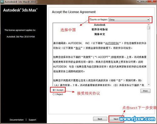 第5步、安装3dsmax2010 32/64位时会有相关的一些协议,我们选择接受(I accept),国家或地区选择中国(china),点击next下一步安装。 如图五。