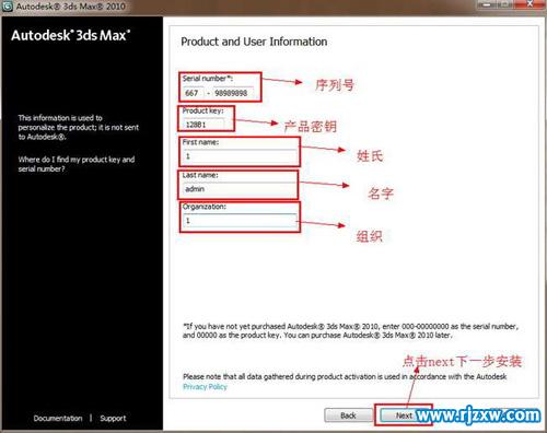 第6步、在这个界面里提到一个很关键的一步,就是序列号(serial number)和产品密钥(product key),序列号有这么几组:666-69696969, 667-98989898, 400-45454545,这里任意一组都可以用。产品密钥:128B1。 接下来是用户个人信息,可以如实填写,也可以按照图中填写,点击next下一步安装。 如图六。