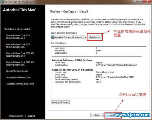 第7步、选择产品配置(select a product to configure)里可以更改3dsmax2010 32/64位英文版的安装路径,点击配置(configure)进入更改安装路径. 如图七。