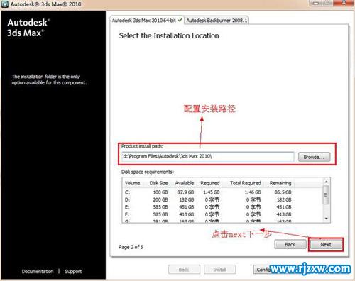 第9步、一般情况下3dsmax2010 32/64位英文版默认安装路径在c盘符里,我们更改安装在别的盘符,本案例安装在d盘符。点击next下一步配置。 如图九。