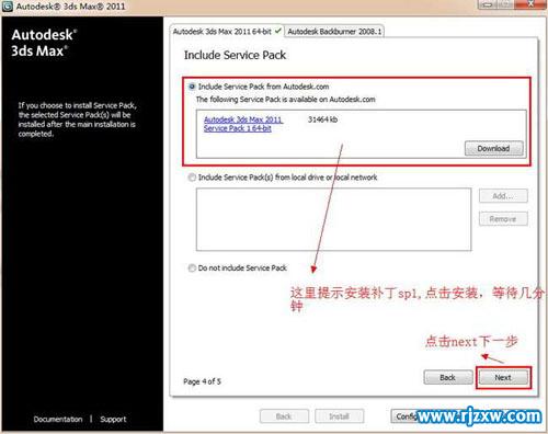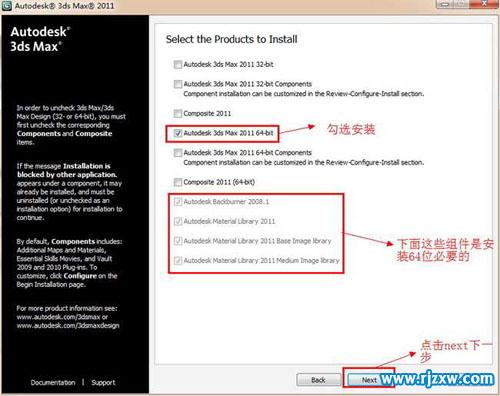 第4步、选择安装3dsmax2011 64位英文版,这里有好多的插件,你可以根据需要来勾选安装插件,这里只勾选了安装3dsmax2011 64位英文版,下面那些灰色的勾,代表安装3dsmax2011 64位英文版时相对的补丁或是插件。