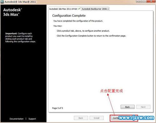 第12步、3dsmax2011 64位英文版各项都配置完成 了,点击配置完成(configuration complete),返回3dsmax2011 64位英文版程序安装。