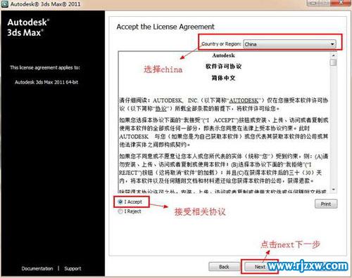 第5步、最上面一栏国家或是地区(country or Region),我们选择中国(china)。下面的一栏选择我接受(I accept)。点击next下一步安装。