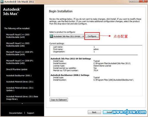 第7步、这里我们可以看到3dsmax2011 64位英文版安装路径,但默认是c盘符,安装在c盘会使电脑运行更慢,所以点击配置(configuration),更改安装路径以及相关的设置。