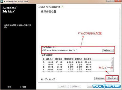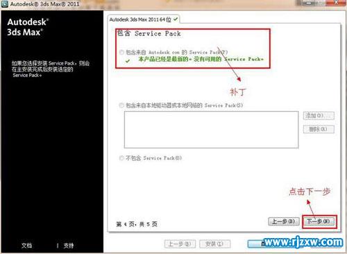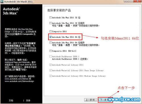 第4步、在这个界面,我们看到了好多的子组件的选择,我们就选择安装3dsmax2011 64位中文版。点击下一步。