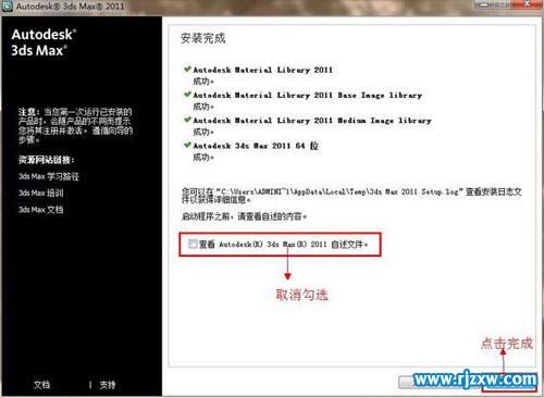 第15步、等待几分钟后,3dsmax2011 32/64位中文版安装完成。取消勾选查看自述文件,点击完成。