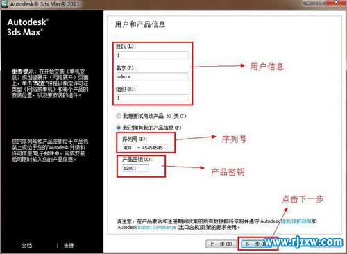 第6步、上面一栏是用户信息,可如实填写,也可按图片上的填写。接下来是产品序列号和产品密钥:产品序列号有这么几组:666-69696969, 667-98989898, 400-45454545 。产品密钥是:128C1(标准版),495C1(设计版。点击下一步。