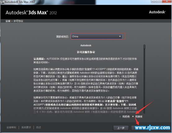 第4步、下面进入Autodesk 3dsmax的安装许可协议,协议实在太长了,没时间看了,直接点我接受。 如图四。