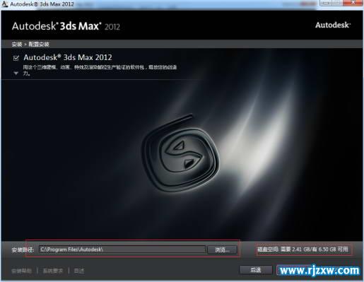 第6步、选择3dsmax2012中文版的安装路径,默认安装的实在c盘,那个磁盘够用就放那个盘。 如图六。