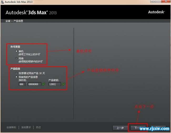 第五步、选择单机。产品序列号为:666-69696969,产品密钥为128E1。输入后点击下一步。
