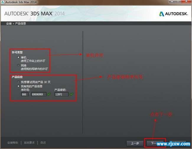 第五步、产品信息设置单机,序列号:666-69696969,密钥:128F1,然后点击下一步。