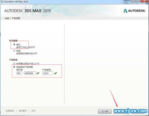 第5步、许可类型选单机。产品信息的序列号:666-69696969,产品密钥为128G1,点击下一步。
