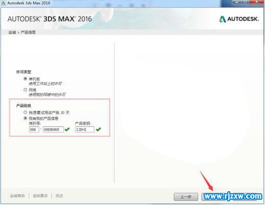 第4步、选择单机版,输入序列号:666-69696969,产品密钥为:128H1,点击下一步。