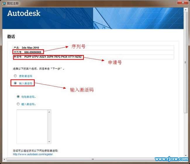 3、一定要注意页面上面的申请号,再选输入激活码,点击下一步。