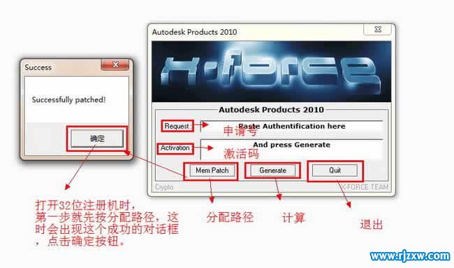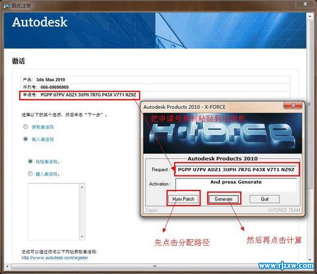 | 软件简介: 3dmax2010注册机下载64位的激活注册方法: 1、安装3DMAX2010。 2、输入序列号: 666-69696969或者667-98989898或者400-45454545。 3、输入产品密钥:Max用128B1,Design用495B1。 4、完成安装后重启软件。 5、选择“激活” 下面是激活的步骤, 6、当激活窗口出现的时候,点击下一步,启动注册机。 7、把申请码复制下来,粘贴到注册机的“Request”处,点击注册机中“MemPatch”,稍后会出现成功提示。 8、然后再点“Generate”生成激活码。 9、把生成的激活码复制后粘贴到MAX2010的激活对话框中,点“下一步”。提示“激活成功”。 3dmax2010注册机下载64位的激活步骤图解: 1、双击桌面上面的3dmax2010软件。