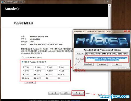 软件简介:3dmax2011激活资讯介绍:一、安装序列号(Serial number):666-69696969, 667-98989898, 400-45454545 二、产品密钥 (Product Key) 3ds Max 2011 : 128C1 3ds Max Design 2011 :495C1 三、激活步骤 1、 在软件激活界面点击“激活”(Activate)按钮,然后选择“我具有Autodesk提供的激活码”(I have an activation code from Autodesk) 2、运行注册机,从激活界面复制申请码(Request code)粘贴到注册机的"Request"栏中,点击"Generate"按钮生成激活码(Activation) 3、点击注册机上的“Mem Patch”按钮(非常重要) 4、注册机中复制激活码粘贴到软件激活界面的输入框中,点击“下一步”(Next),完成激活。 3dmax2011 64位激活注册教程:第1步、打开刚安装好的3dmax2011 64位软件。