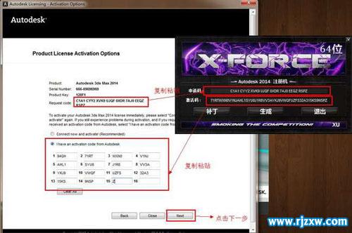 10、然后再把页面的申请号复制到注册机里面,点击生成计算。然后把激活码复制页面中去。点击下一步。