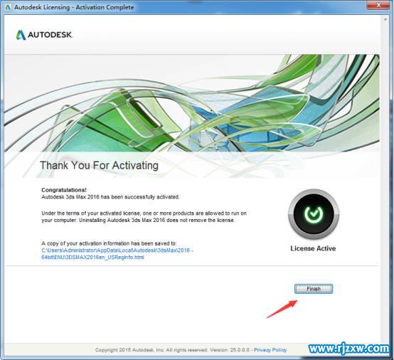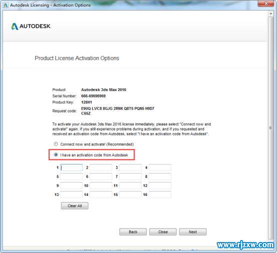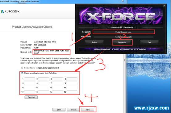 软件简介:3dsmax2016注册机激活步骤方法:1、请先安装max2016的软件,具体可以参考安装教程页面。 2、使用序列号 666-69696969。 3、使用产品密匙:128H1 4、安装完毕后,打开3dmax2016软件,这时候会出现激活页面,点击“Activate”,然后下1步,填写序列号和密匙。 5、开始使用 XFORCE Keygen 64 位版本注册机,点击注册机上的补丁按钮。 6、复制软件激活界面的请求代码(request code)到注册机并点击“生成”按钮,并且复制注册机上的“激活码”。 7、回到软件激活界面,然后单击下一步,点击“i have an activation code from Autodesk”单选框,然后再粘贴激活码到下面的方框即可完成激活! 友情提示: 请确保您正在运行注册机要右键管理员身份。安装完成后,在开始菜单中选择简体中文版的快捷方式(桌面的快捷方式默认英文)。 3dmax2016 64位激活教程图文说明:1、双击打开刚安装好的3dmax2016 64位软件。