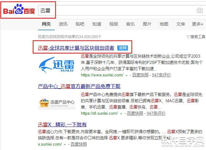 | 软件简介: 第1步、在百度输入迅雷,点击有官网的网址。